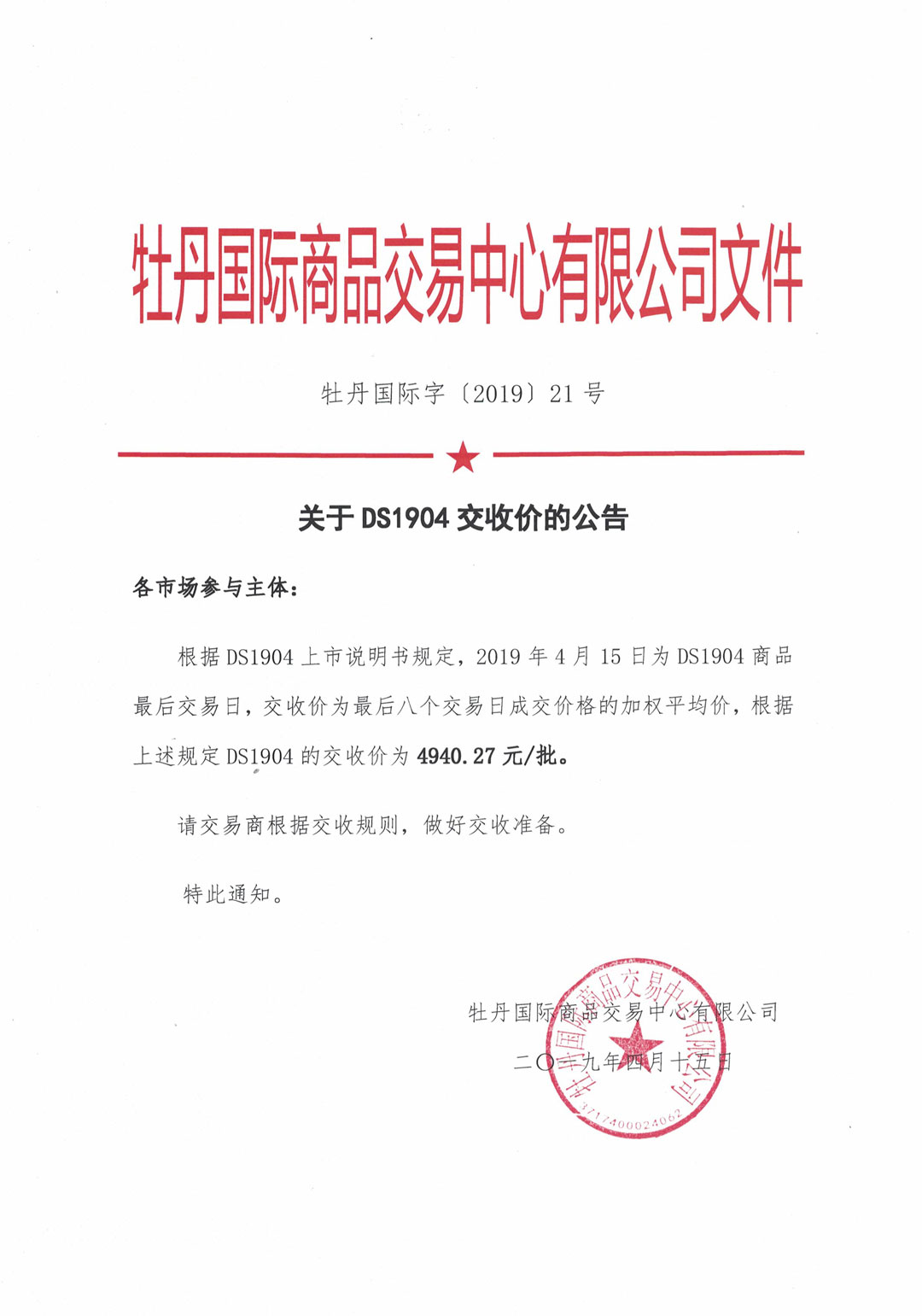 關(guān)于DS1904交收價(jià)的公告