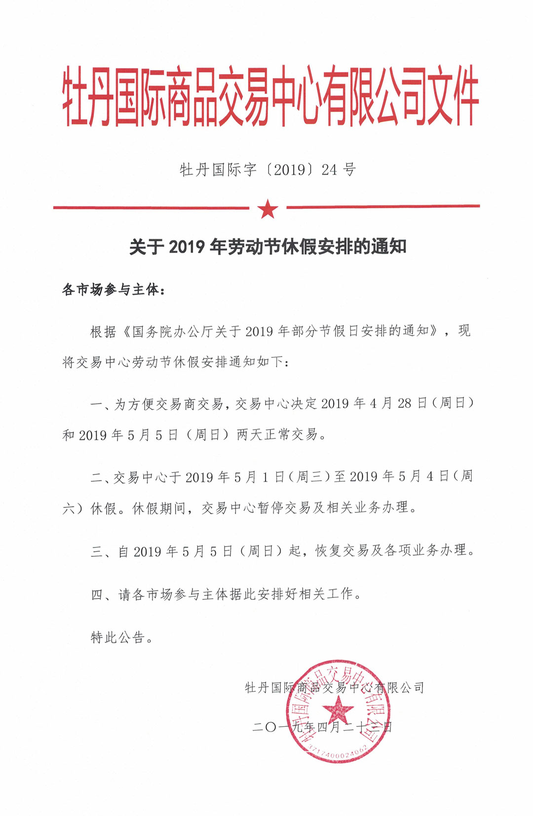關(guān)于2019年勞動節(jié)休假安排的通知