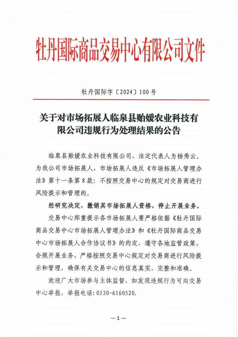 關(guān)于對(duì)市場(chǎng)拓展人臨泉縣貽媛農(nóng)業(yè)科技有限公司違規(guī)行為處理結(jié)果的公告